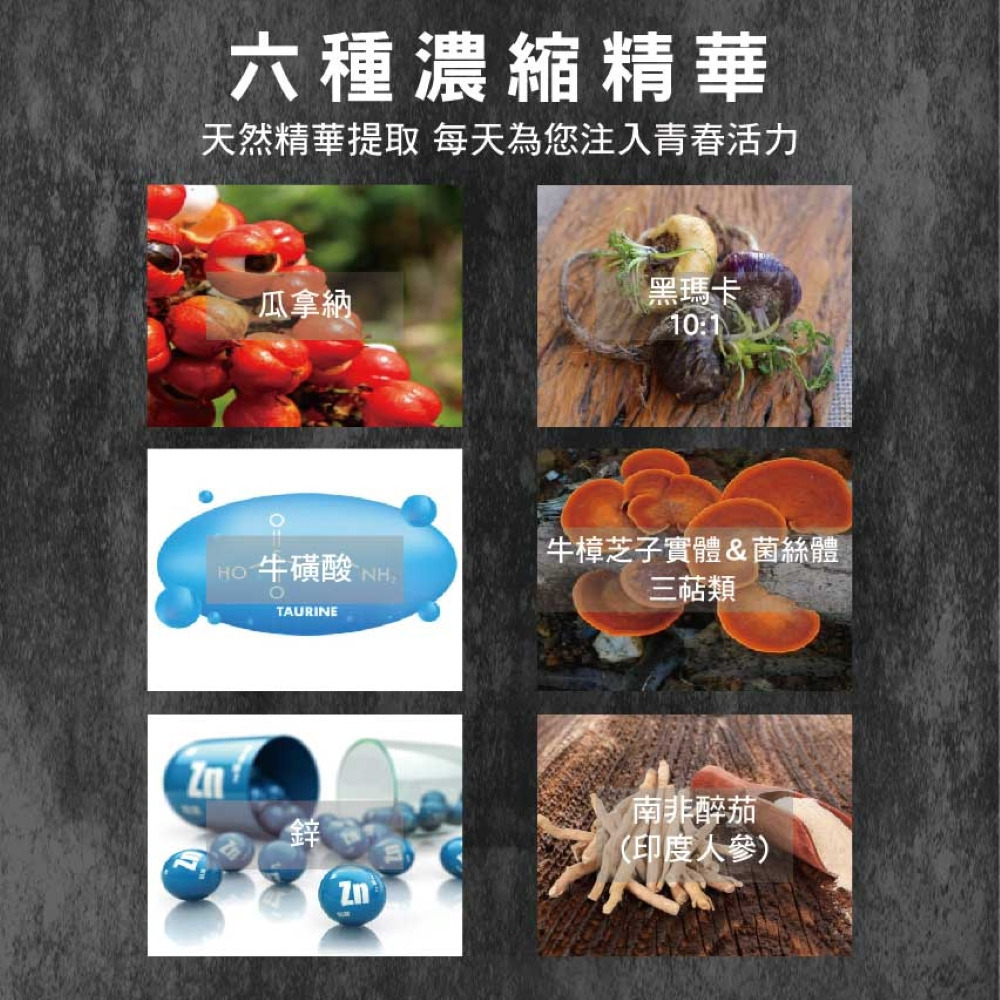 L-精胺酸、瓜拿納萃取、瑪卡萃取、牛磺酸、葡萄糖酸鋅、蚓激酶(日本專利紅蚯蚓SK末)、綜合胺基酸(L-精胺酸、鹽酸L-二胺基己酸、L-異白胺酸、L-α胺基異戊酸、L-白胺酸)、牛樟芝子實體與菌絲體混合之萃取物、南非醉茄根萃取