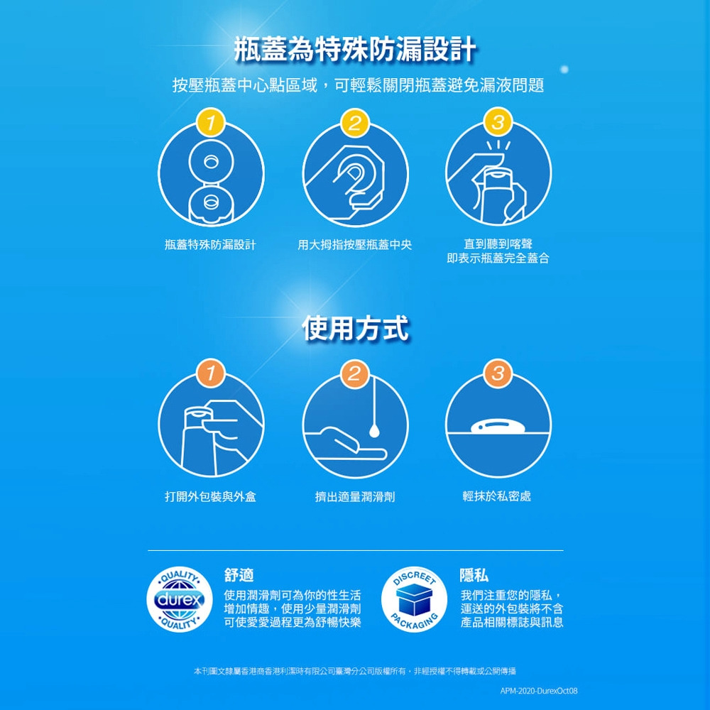 杜蕾斯 KY潤滑凝膠 潤滑劑 100g大部份女性均會遇到陰道乾燥的問題,簡單如生活壓力、疲倦或經期也會導致這種情況。杜蕾斯KY潤滑劑正是根據婦科研究結果而特別生產的人體潤滑補給用品。杜蕾斯KY潤滑劑是一種無色無嗅及不油不膩的水溶性凝膠狀潤滑劑,可以清水洗淨及不會留在人體內,能減低因摩擦所產生的不適及避免過敏情況。產品特色 :與人體分泌最相近,給您最自然的感覺。無色無嗅及不油不膩的水溶性凝膠狀潤滑劑。可以清水沖洗及不會留在人體內。